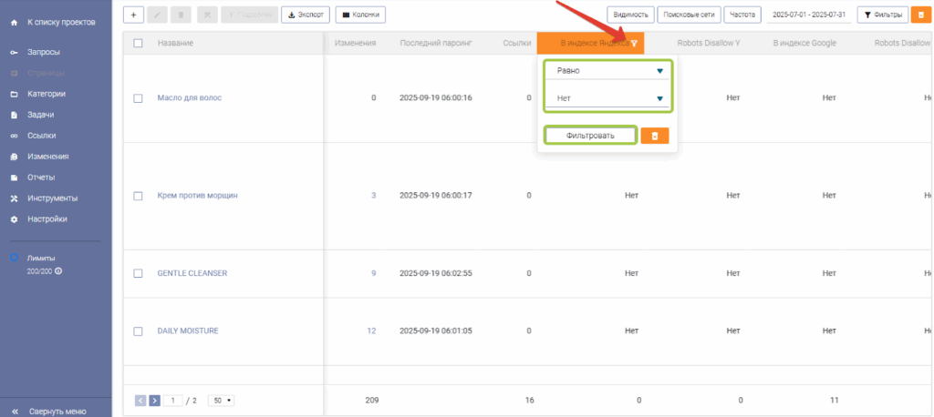 После этого в таблице будут отфильтрованы все страницы, которые на момент парсинга отсутствовали в индексе поисковой системы.