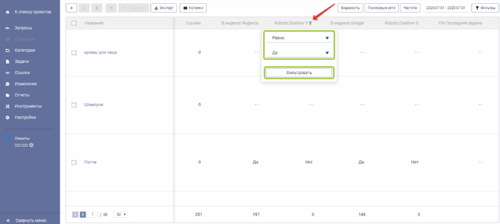 После этого в таблице будут отфильтрованы все страницы, которые на момент парсинга были запрещены к индексации в Robots.txt в выбранной поисковой системе.