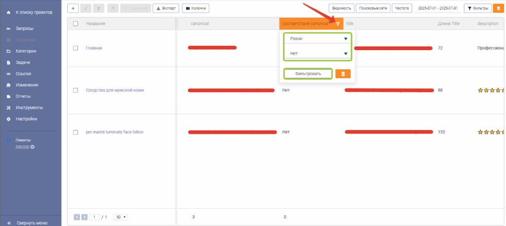 После этого в таблице будут отфильтрованы все страницы, у которых на момент парсинга URL в атрибуте canonical не совпадал с URL страницы.