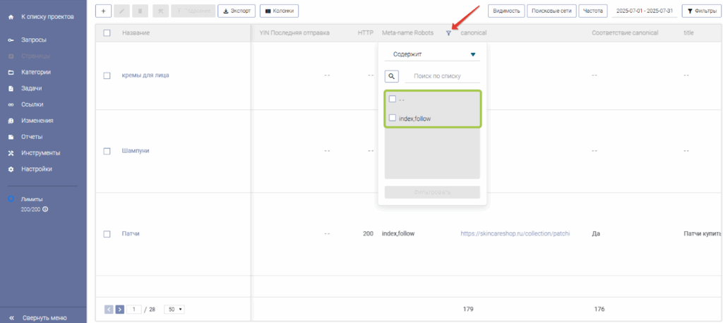 После этого в таблице будут отфильтрованы все страницы, которые на момент парсинга были запрещены к индексации в <meta name=«robots»>.