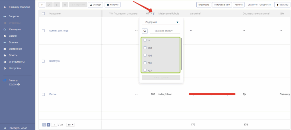 Для того чтобы проверить, есть ли страницы, запрещенные к индексации из-за некорректного кода ответа сервера, достаточно нажать на иконку фильтрации в колонке «HTTP» и посмотреть, какие значения есть в меню фильтрации. Если значений, связанных с запретом к индексации, в меню нет, то причина отсутствия страницы в индексе не в этом.