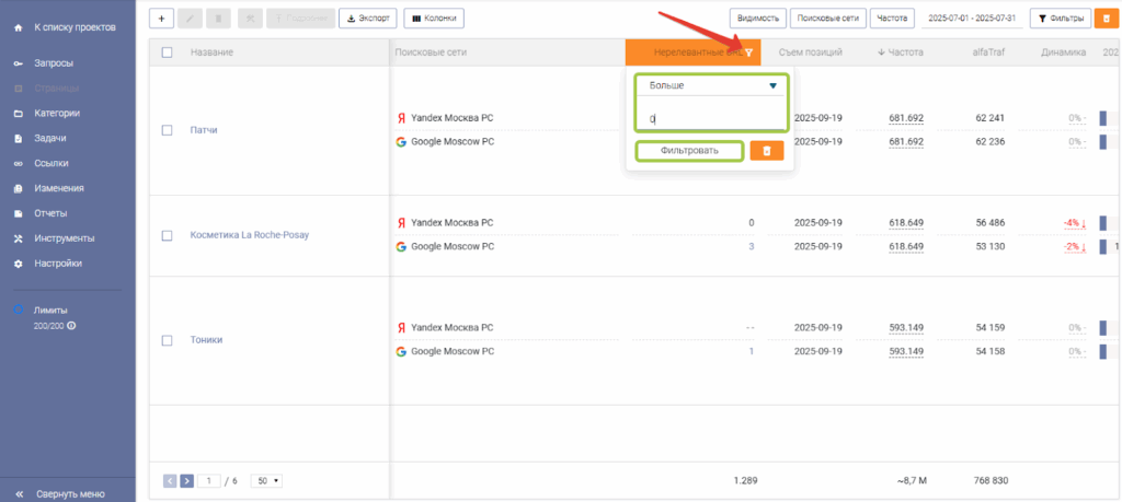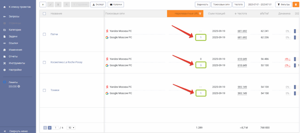 После этого в таблице будут отфильтрованы все страницы, у которых на момент съема позиций по запросам, относящимся к данной странице, были обнаружены нерелевантные URL (то есть URL, несоответствующие целевой странице, которую вы указали при внесении запросов в сервис).