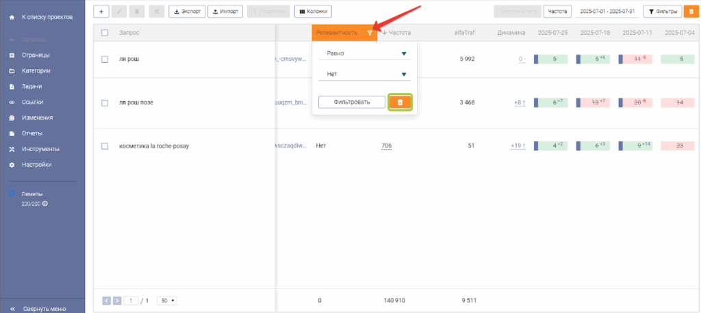 Если вы добавили к каждому запросу целевой URL, то для того чтобы найти нерелевантные URL, на экране «Страницы» необходимо отфильтровать колонку «Нерелевантные URL».