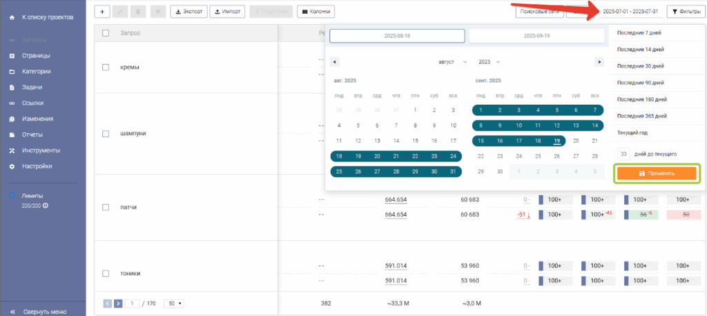 Например, вам необходимо найти все запросы, которые вышли из Топ-10 за последний месяц. Для этого укажите в календаре соответствующий период и нажмите кнопку «Применить». Данные в таблице пересчитаются за выбранный период.