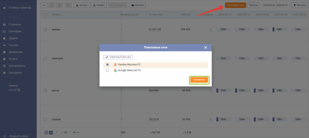 Выберите поисковую систему, которую собираетесь анализировать. Для этого нажмите кнопку «Поисковые системы» в правом верхнем углу экрана, выберите необходимую ПС и нажмите кнопку «Применить».