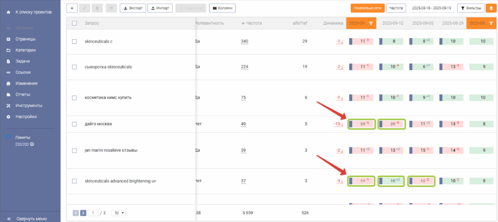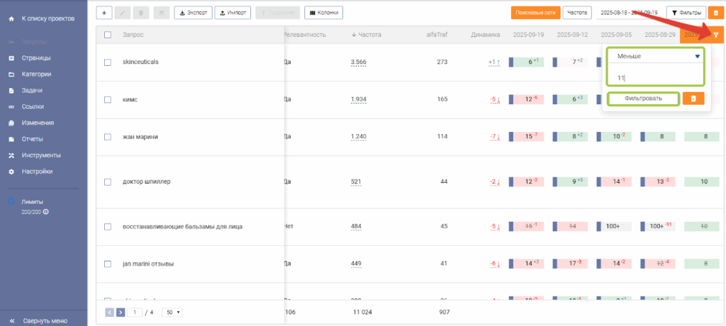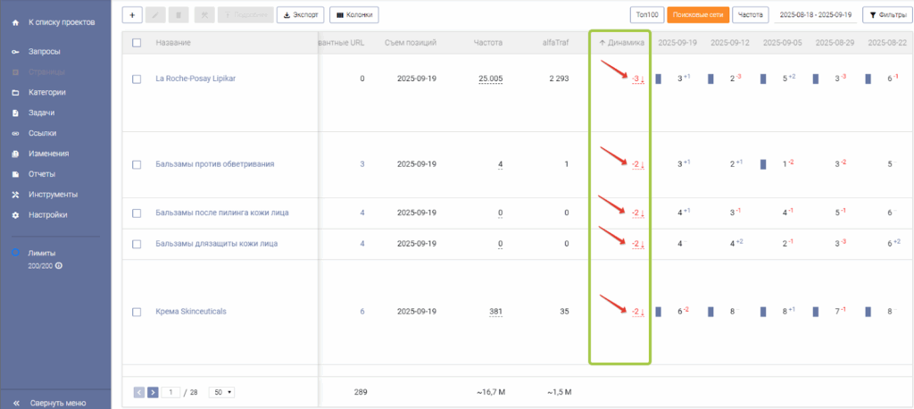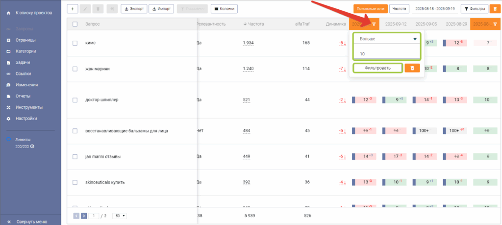 Для того чтобы найти запросы, которые просели в позициях, можно воспользоваться фильтрами в колонках с указанием даты съема позиций, а также «Динамика».