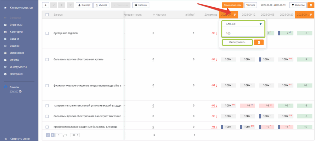 - На экране «Запросы» отфильтровать запросы по колонке последней даты съема позиций, выбрав параметры в фильтре «Больше» и «100». Таким образом, в таблице отобразятся все запросы, которые вышли из Топ-100 в последний съем позиций. Выпадение запроса за Топ-100 – один из сигналов, что продвигаемая страница могла быть удалена из индекса поисковой системы.