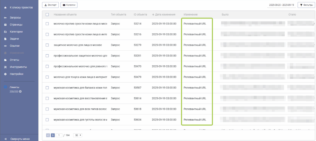 - На экране «Изменения» проверить изменения за дату последнего съема позиций. В колонке «Изменение» будет указан тип изменения «Релевантный URL».