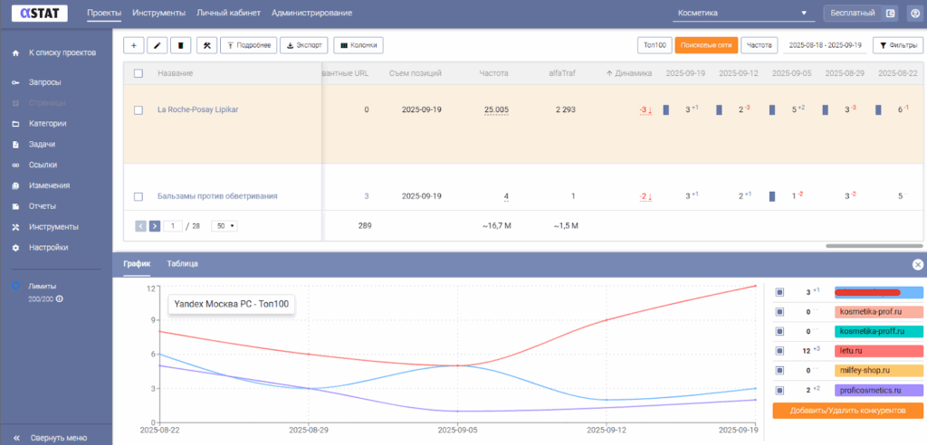 Для оценки ситуации в выдаче воспользуйтесь отчетами «По конкурентам» и «По видимости».